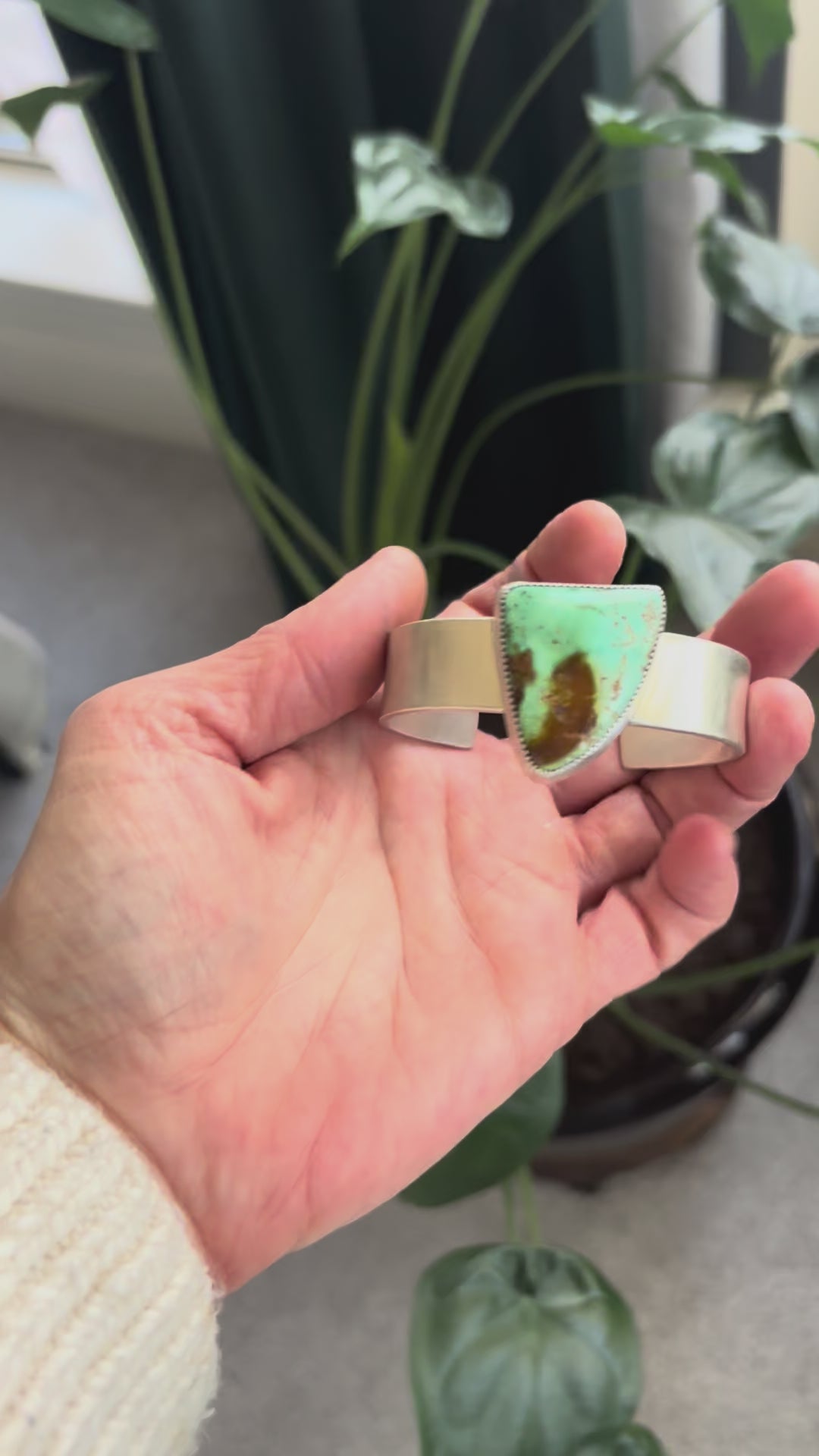 Gorgeous Thick Heavy Royston Turquoise stone with rich red-brown matrix sits on a thick, hand-forged sterling cuff. The colors feel grounded and natural—soft sky green against warm earth tones.